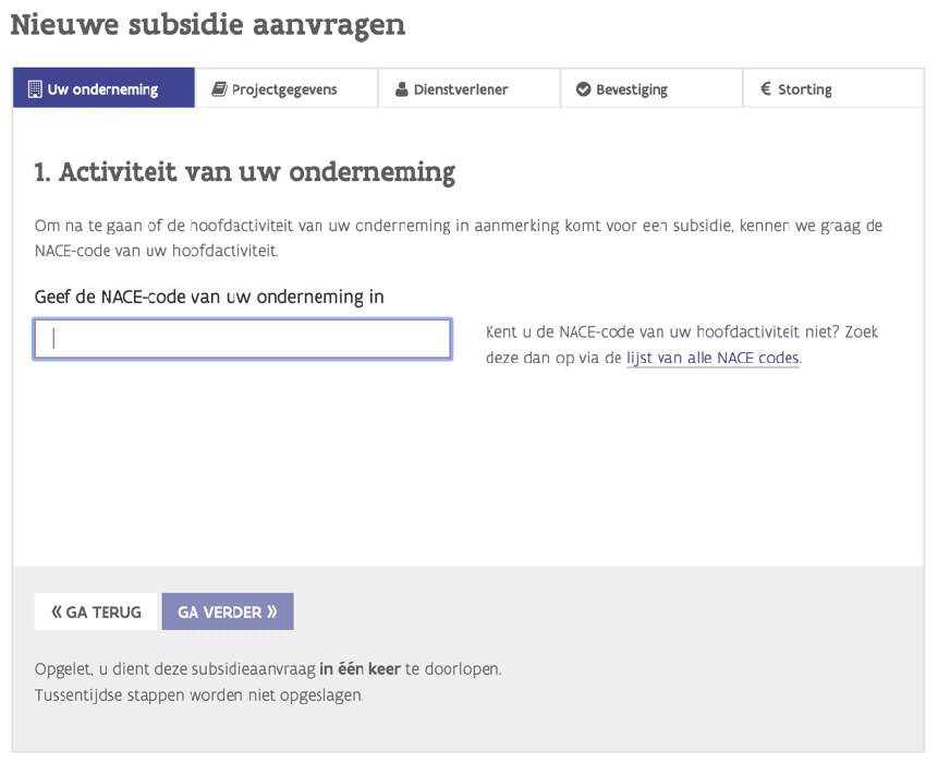Niet gekend? Klik op lijst van alle NACE-codes om de code op te zoeken